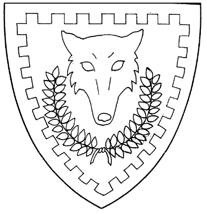 mask gules within a wreath vert, an embattled bordure azure.
